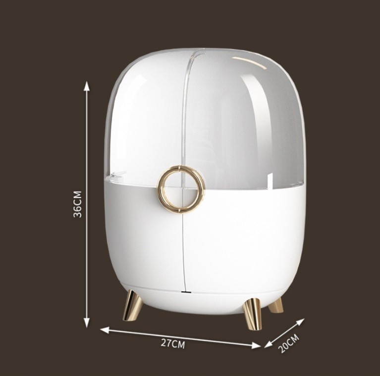 Скринька виконана з акрилу в модному кольорі, додаткові золоті елементи надають виробу ексклюзивності. Прозора кришка дозволяє легко знайти необхідну косметику.