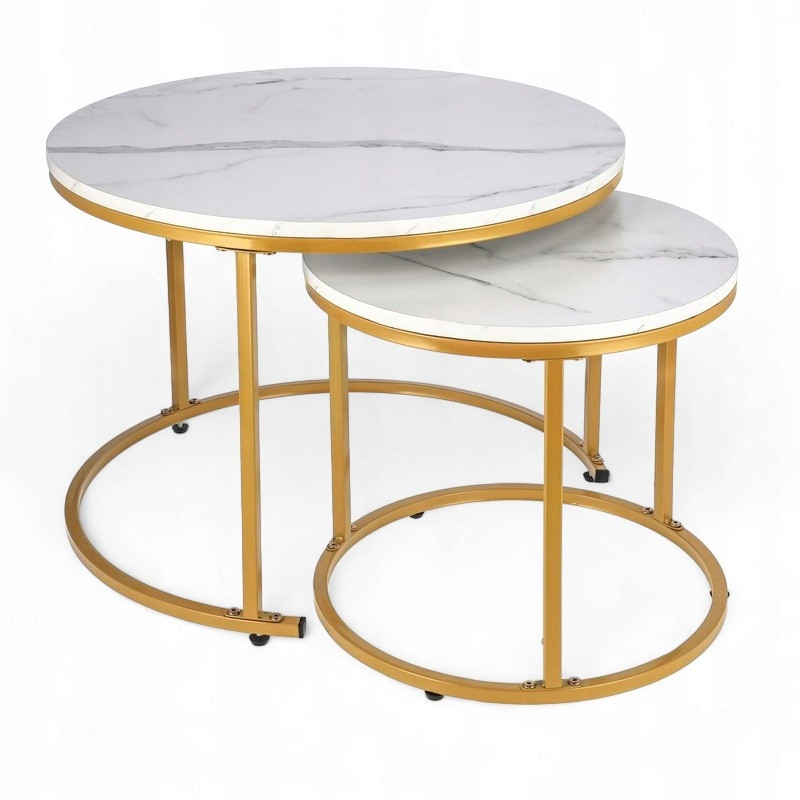 Елегантний комплект журнальних столиків у відтінках білого мармуру та золота, натхненний індустріальним стилем.