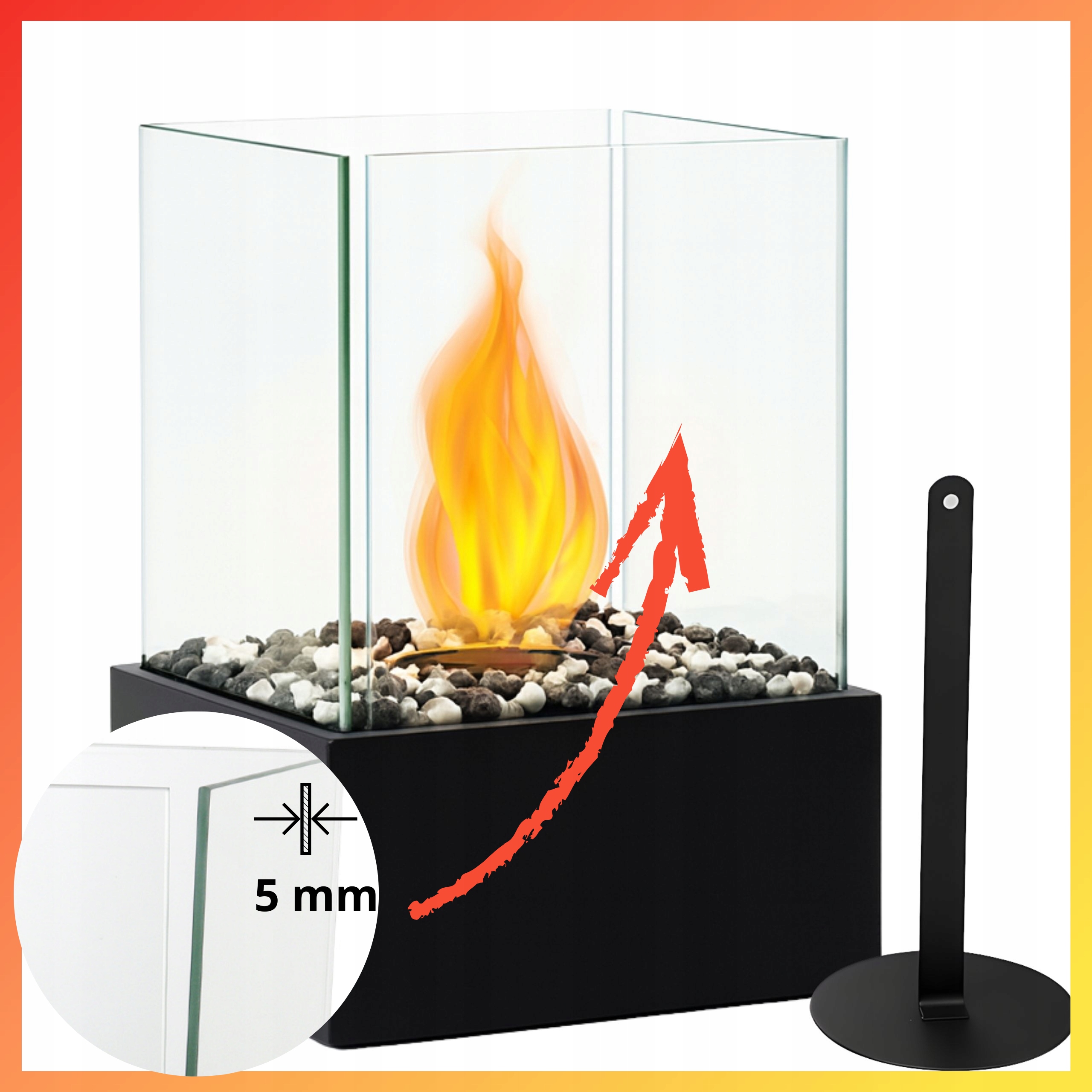 Загартоване боросилікатне скло товщиною 5 мм ефективно захищає полум'я, а стабільна конструкція забезпечує безпечне використання в повсякденних умовах. Вогнегасник, що входить до комплекту, дозволяє швидко та контрольовано загасити полум'я в будь-який час.